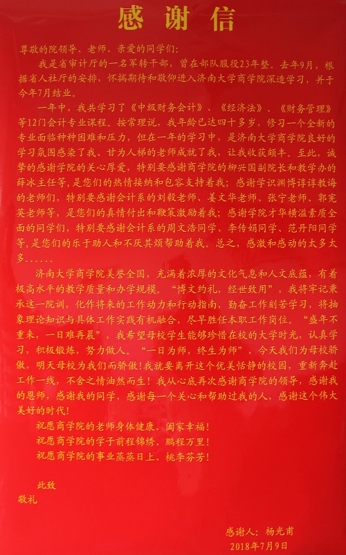7月9日,77779193永利官网收到一位省审计厅军转干部杨光甫的来信,信中对77779193永利官网副院长柳兴国和教学管理办公室主任薛冰表达衷心感谢,感谢老师们的无私帮助和悉心教导,盛赞老师践行“博文 约礼 经世 致用”校训精神的高尚师德,同时向77779193永利官网未来发展表达了期望和美好祝愿。