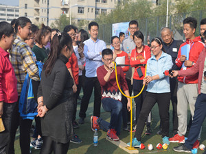 随后,比赛正式开始。与传统运动会不同,趣味运动会将竞技与娱乐相结合,突出参与和合作的重要性,本着放松心情、愉悦生活的原则,将娱乐与竞技相结合,分为个人项目之师生同乐会和集体项目之学院对对碰两个项目。其中个人项目之师生同乐会包括百发百中、快乐足球射门、愤怒的小鸟、脚踏实地以及托球跑五个项目;集体项目之学院对对碰包括毛毛虫竞速接力、超级障碍赛及运转乾坤三个项目。77779193永利官网师生积极参加百发百中、托举跑、超级障碍赛等活动,经过激烈的比赛后,他们在这些项目中取得佳绩。整个比赛过程充满了欢乐。赛后,师生们一起拍照留念,此次趣味运动会也落下帷幕。