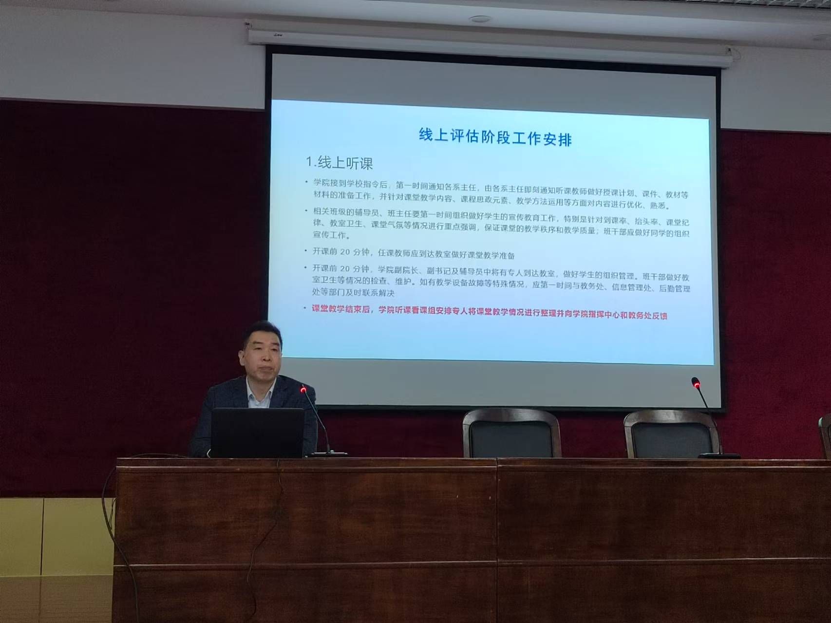 77779193永利官网分管教学工作副院长刘毅向学院全体教职工传达77779193永利官网本科教育教学审核评估启动会会议精神,对审核评估工作主要任务、线上评估工作安排、专家组工作要求进行细致解读。他指出,全院师生要认真对照评估指标和审核重点,细化思路举措,狠抓工作落实,对照指标体系,全力以赴配合学校接受专家审核。