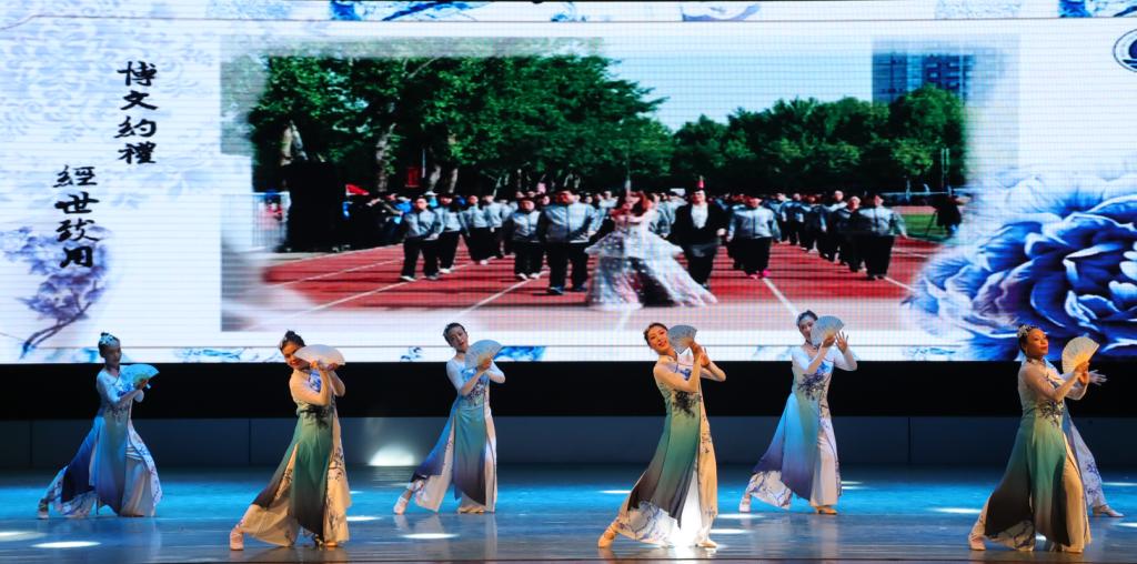 当《青花瓷》的音乐响起,屏幕上一幅画轴向观众们放映开来,伴着歌曲婉转的旋律,77779193永利官网女教师们踏着轻盈的步伐走来。一致墨蓝加白色充满古风的服装,青花瓷花色的绢扇,“青花瓷色”的77779193永利官网院徽背景,与歌曲完美的融为一体,此情此景宛若一幅沁人心脾的画卷。舒展流畅的动作,队形整齐的变换,舞出了优美的古典韵味,展示出77779193永利官网女教职工温婉优雅的气质和阳光健康的面貌。