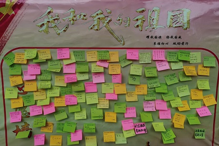 国旗护卫队的同学们通过QQ、微信、心愿墙等途径宣传了爱国和护旗知识,并在经管楼广场旗杆处为同学们做了护旗周下连队宣传演讲。演讲指出国旗不仅仅是一面旗帜,它是一种希望,更是一种信仰。激情的演讲赢得了同学们的阵阵掌声。随后,同学们在“我和我的祖国”心愿墙上写下了自己在本次活动中的心得体会,并将心愿墙贴满便利贴。同学们纷纷表示,山河无恙,家国梦圆。自己要努力学习,踏实工作,做社会主义现代化建设的合格建设者和接班人。