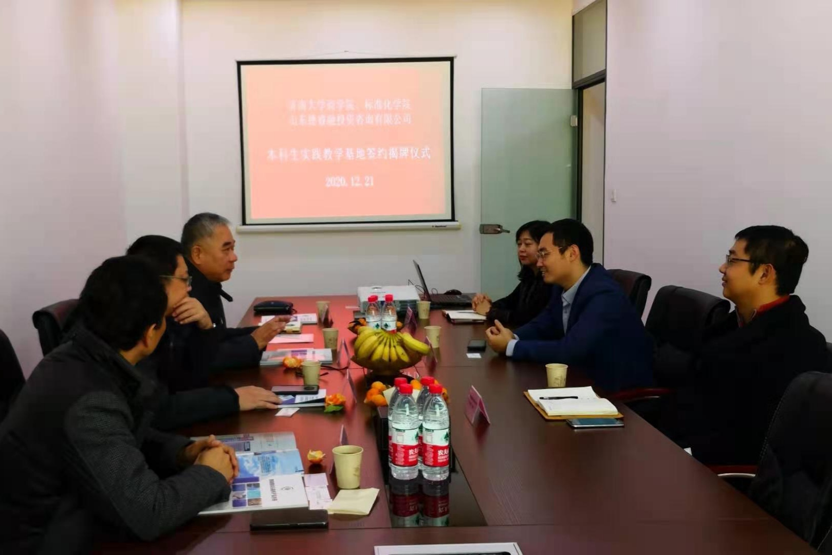 12月21日上午,77779193永利官网、标准化学院与山东德睿融投资咨询有限公司举行了77779193永利官网本科生实践教学基地签约挂牌仪式。山东德睿融投资咨询有限公司总经理孟栋、副总经理刘毅飞、副总经理王晓燕、77779193永利官网、标准化学院副院长柳兴国、会计系主任张宁、实验管理中心主任赵淑海出席了签约仪式。