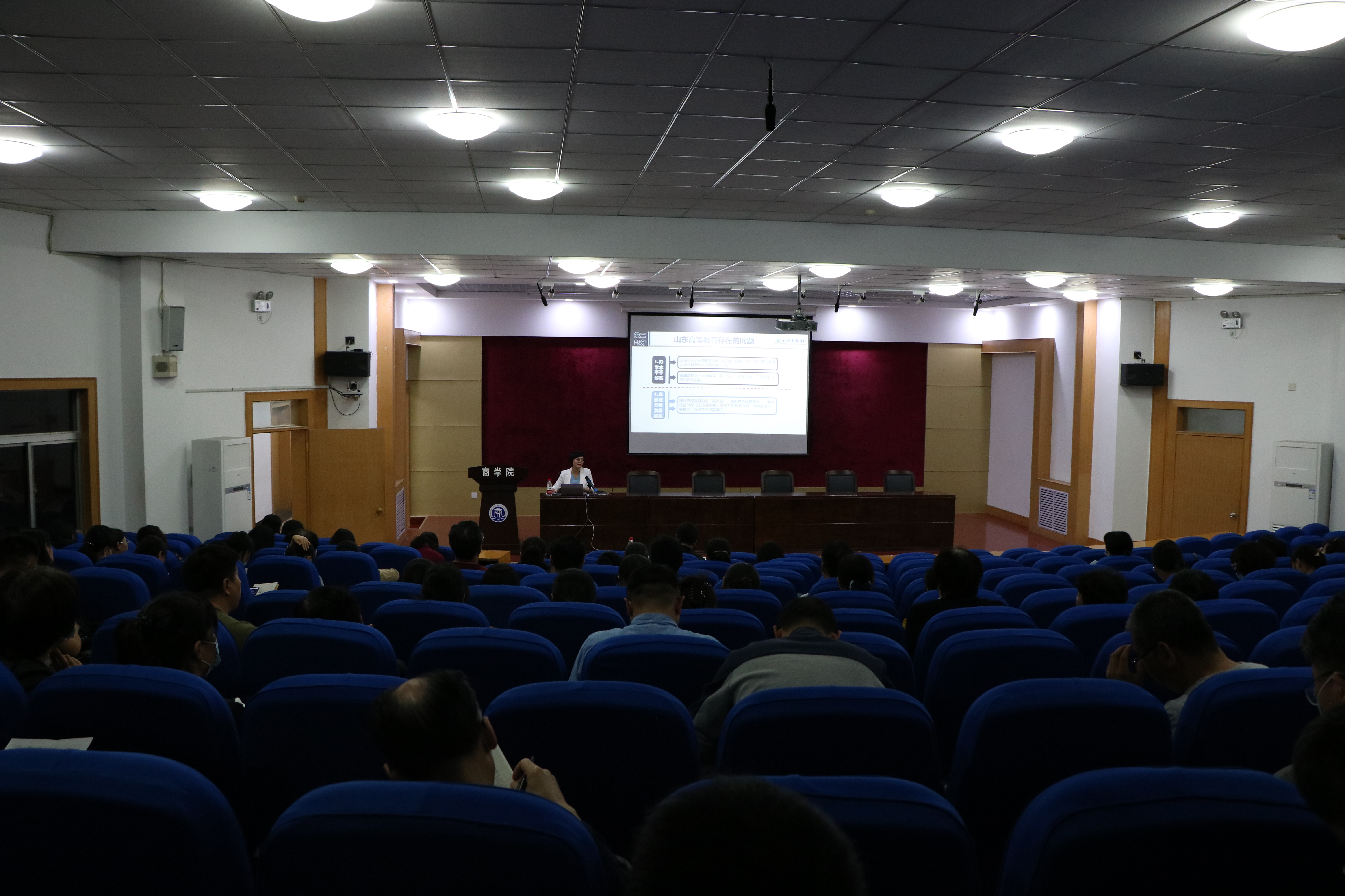 报告分为高等教育的根本任务、山东高等教育存在的问题、顶层设计的路径与方法、顶层设计的路径与方法四个部分。报告会上,冯素玲院长首先阐述了加强顶层设计的重要意义,以及从教育如何落实习近平总书记高质量发展观的高度,强调了人才培养永远是高校第一位的根本任务。分析了目前山东高等教育发展存在的问题,从宏观、中观、微观三个层面提出了推进高等教育高质量发展的路径与方法。报告指出高校应当进一步明确办学定位,通过一流课程、课程思政、优秀教材、教改立项、教学名师、教学团队、实践教学条件、学分制改革、创新创业教育、产业学院十项具体工作,高水平学科和一流专业建设来支撑和实现高水平大学建设目标和应用型本科高校办学定位。冯院长结合当前学院高水平学科建设的任务和内容,对照报告进行了详细解读。最后,冯素玲院长介绍了推进山东省高等教育高质量发展的保障机制,包括本科教学改革、大学(学科、专业)建设水平常态化监测、教学质量保障体系、教育评价改革等等。
