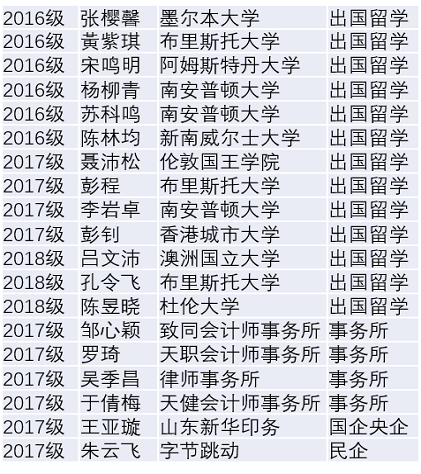 本科生一次就业率在90%以上,主要去向是农行、招商、浦发等金融机构,中国重汽、鲁能集团、蒙牛集团等知名企业和信永中和、瑞华、立信等会计师事务所。近15%的优秀毕业生考取厦门大学、中国人民大学、山东大学、中国海洋大学、东北财经大学、天津财经大学等知名高校的研究生。近10%的毕业生考取财政、税务、人社等部门或系统的公务员。近5%学生到加州大学、纽约大学等国外大学留学。为提高学生“两创”能力,实施“一生一赛”措施,鼓励大学生参加各类大赛,近三年获得省级以上科技创新竞赛奖80余项,其中CIMA全球商业精英挑战赛(GBC)华东区域决赛冠军,全国“挑战杯”创业计划大赛铜奖1项、全国大学生会计信息化技能大赛全国一等奖2项。