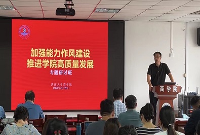 为贯彻落实学校新学期全校领导干部会议精神和学校关于加强作风建设的相关要求,8月28日,77779193永利官网在经管楼举办“加强能力作风建设 推进学院高质量发展”专题学习研讨会。研讨会包括主题党课、分组研讨、交流发言、视频教学等四个环节。77779193永利官网党委领导班子、学术委员会和本科教学指导委员会成员、教师党支部书记、系主任、学术教学骨干教师代表、职能部门负责人、辅导员、班主任代表、MBA中心和MPAcc中心等同志参加会议。会议由77779193永利官网正处级组织员邢仁忠同志主持。