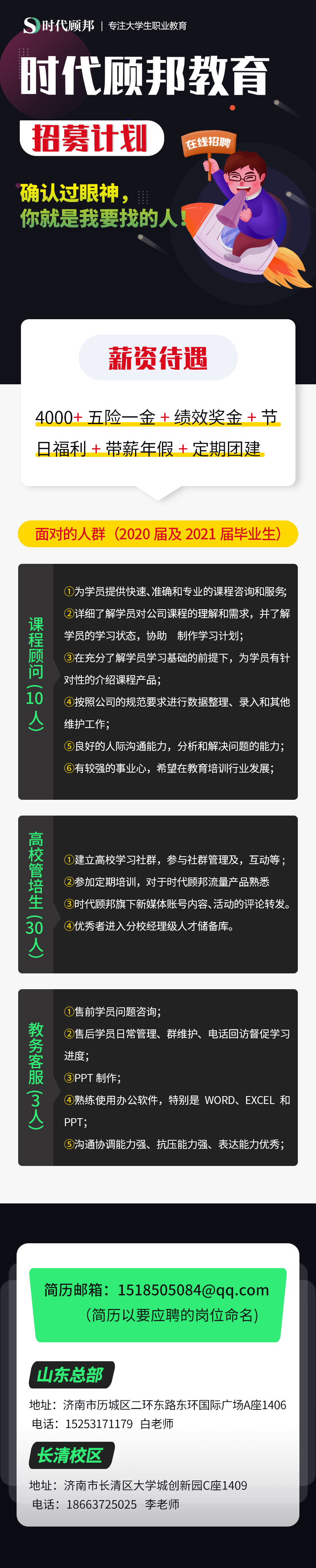 时代顾邦教育2020招聘公告管培生招聘30人课程顾问招聘10人教务客服招聘3人第一阶段简历投递截止6月3号,面试时间6月4号。第二阶段简历投递截止6月9号,面试时间6月10号。面试地点:济南市历城区东环国际广场 A座14层简历命名:XX岗+姓名投递邮箱:1518505084@qq.com