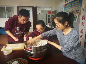 活动前,青协负责人联系舜耕日间照料中心负责人确定活动开展的时间、地点、内容以及形式,并召开会议,对参加本次活动的志愿者进行培训。活动伊始,志愿者为老人播放关于重阳节的介绍视频及PPT,让他们知道重阳节的来源和小故事。随后,志愿者细心的帮助老人打扫卫生,并亲手制作重阳糕送给他们。老人们纷纷对志愿者表示感谢。之后,志愿者邀请老人与他们一起包饺子感受天伦之乐。最后,一位志愿者说道:“这些老人都与我的爷爷奶奶一个年纪,与他们一起包饺子让我感受到了爷爷奶奶对我的关怀。同时,能够帮助到他们也让我十分开心。”本次活动,在留影合照中结束。