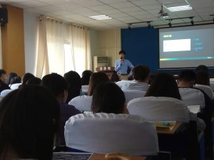 讲座伊始,王加军老师通过与学生做游戏的开场互动,活跃现场气氛。然后,王老师带领同学们仔细分析了中国雅思考生现状:普遍低龄化,我国东部、南部居多。山东的考生虽多,但在写作水平上还是有待提高的。接着,王老师凭借多年的海外经历和教学经验,生动深刻地分析了雅思写作的评分标准,对大家雅思听说读写四科的备考提供了高效宝贵的提升技巧。王老师讲话诙谐幽默、深入浅出,与同学们进行多次互动,并列举一些典型事例证明现如今学习英语的重要性。王老师指出,为了保证同学们的听课质量,每个班的学生人数都严格限制,而且新东方还提供出模考,让学生真实感受到雅思考试时的紧张以及测试出自己的真实考试水平。讲座接近尾声时,王老师鼓励大家:“只要具备学习雅思的恒心与毅力,坚持不懈的学下去,肯定会成功的。”最后,同学们对王老师精彩的讲座报以热烈的掌声,此次讲座圆满结束。