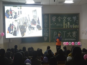 活动开始前的准备阶段,自律会工作人员设计主题黑板报,粘贴彩色气球,简单布置活动现场,为参赛选手们创造了一个简单温馨的良好氛围,为此次活动的展开做好充足的准备。随着选手们陆续签到入场,主持人宣布活动正式开始。参赛选手们各展身手,制作的PPT不仅真实有趣,而且他们口齿伶俐,幽默的话语逗得在场的观众捧腹大笑,现场氛围十分火热。活动期间,主持人还穿插了小游戏,让观众们共同参与进来。经过一番轻松快乐的比拼后,所有选手的PPT都已展现完毕,主持人宣布了各选手的得分。最后,在一片欢声笑语中,本次宿舍文化节PPT大赛顺利落下帷幕。