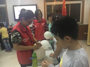 活动以做花灯、吃月饼等形式展开,活动前期,志愿者与基地负责人联系,学生、家长和志愿者集合后,主持人首先简要向大家介绍了中秋节的来历和典故,随后,全部人员通过动手制作华灯和学做传统月饼,提前庆祝中秋。在活动过程中,家乡和孩子们积极参与,充分发挥聪明才智,利用各种各样的材料制作出创意无限、造型别致的灯笼,志愿者观察并发现参与活动的家庭互动方式,引导家长和青少年进行良性互动,中秋话月、亲友团聚,拉近了家长和孩子之间的距离,最后,志愿者将做好的花灯逐一展示并分发奖品。