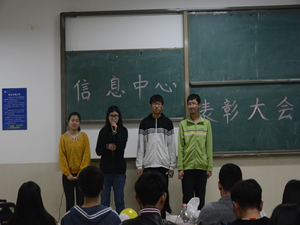 本次大会一共分为信息中心成立仪式、部门才艺展示、优秀通讯记者颁奖仪式三个部分。活动开始,信息中心主席杜硕对各部门的工作进行了充分的肯定,也对大家未来的工作给予了殷切的期望。随后进行第二部分,有歌曲、舞蹈、小品、相声、器乐演奏节目等,其中网络技术部带来的小品《罗密欧与朱丽叶》让大家爆笑连连,掌声不断。办公室全体干事合唱歌曲《成都》让人如痴如醉,身临其境。活动过程间隙还穿插着抽奖活动,同学们积极参与,现场气氛火爆。在最后一个环节,主席杜硕为董厚溥、戴丽君、苗姝娟、王艺洁、苑子坤、刘蕾、筵佳、李洁、张茜、李耀十位同学颁发优秀通讯记者证书,并鼓励他们再接再厉,百尺竿头更进一步。至此此次大会在一片玩乐声中圆满结束。