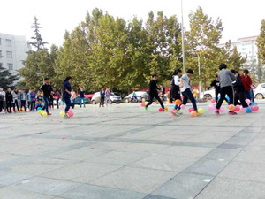 10月13、14日,志愿者们进行有效的宣传与充分的准备。10月16日14时,趣味运动会准时拉开序幕。首先进行的是趣味篮球赛,这场比赛的一大趣味是女生进攻,男生防守,男女搭配引得场上场下欢笑连连,掌声不断,活跃了现场的气氛。接下来的项目是“保卫气球”,游戏规则简单,比赛结束气球最多者获胜,参赛同学既要进攻又要防守,一时竟手忙脚乱。随后,经典的“三人四足”游戏开始,这个游戏考验的便是队友之间的合作,只见三人一组团结一致,喊起口号,向终点冲刺,现场气氛热烈。最后,“疯狂指压板”项目隆重登场,参赛选手通过一系列的障碍到达终点用时最短者获得胜利,台下加油打气声不断。至此,趣味运动会落下帷幕。