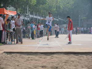 比赛开始前,各位运动员在场下做了充分的热身准备,灵巧的跑鞋,整齐的运动服看上去就给大家一种视觉上的冲击。压腿,伸展跳等准备活动完毕后,比赛正式开始了。比赛的每一次跳跃都牵动着观众的心。伴随着观众的呼喊和啦啦队员的助威,于志磊沉着冷静地将三级跳远的动作发挥到极致,离弦箭般的助跑,刹车似的踏跳,旋风般的腾空,一连串的动作瞬间结束,沙坑中的脚印给观众留下了大大的惊叹号。完美的动作赢得了场下观众的阵阵欢呼,为跳远比赛谱写出一曲动人的旋律。最终,于志磊凭借扎实的能力和超强的爆发力荣获男子三级跳远比赛第八名。