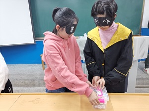 负责人提前组织会议进行小组分工并分配任务,并通过线上线下进行宣传。为更好地使同学们了解盲人群体,实践部两位干事上台为大家讲解国际盲人节和盲人群体的相关知识,讲解内容包括国际盲人节的由来、盲人群体现状以及移动互联网对盲人生活的帮助等。讲解完毕后,盲人体验游戏正式开始,参与人员带上眼罩归置散落物品、叠衣服、默写诗句和名言警句、对指定物品进行绘画。临近活动结束,工作人员邀请同学们在便签上书写了参与游戏的感受和对盲人鼓励的话,并将其和游戏作品贴在一起拍照展示。活动进行顺利,现场气氛活跃,在游戏的同时带领同学们进一步走进盲人的世界,感受不一样的生活。