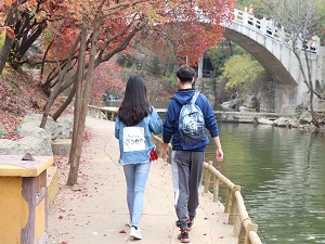 参加活动的全体团员步行进入景区,沿途欣赏了大门景区、绚秋湖、蔷薇园、天趣苑、蔓园、欧洲风情谷、万叶塔等著名景点。其中,团员们在蔓园停驻欣赏的时间最为长,并深深被其独特秀丽的风景所吸引。蔓园位于景区最深的山峪中,共拥有三道山谷,全长800余米。谷中遍地是野葡萄、葛藤等藤蔓植物,它们在枝头缠缠绕绕,寓意永不分离,故蔓园又称“情人谷”。在谷中深处更有同心锁,为来谷的恋人们锁住彼此美丽的承诺。团员们置身其间,欣赏着小桥流水,亭榭楼台,也祝福着所有来来往往的旅人们。在欣赏过程中,不乏有很多令人心动的瞬间,团员们将这些动人的瞬间都定格在了自己的相机里,成为自己美好回忆中的一部分。
