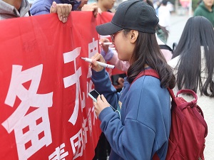 中午十二点,志愿者们准时在经管楼前集合并有秩序地站好队伍。活动伊始,主持人简要介绍关于消防月的相关问题及活动计划,使大家对活动内容有充分了解。随后,两名学生代表带领全体志愿者宣誓。不惧凛冽寒风,眼眸坚毅,高举右拳,以饱满的精神状态宣誓着铿锵有力的誓言。宣誓完毕后,志愿者们依次在横幅上签名,相关人员在此期间则为志愿者们拍摄照片留念,活动随着最后一个名字的落笔正式结束。