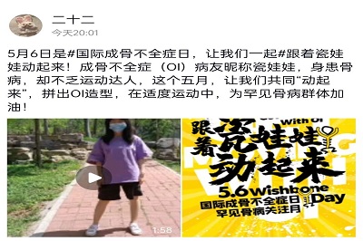 2022年5月6日,是第13个“国际成骨不全症日”。为给罕见骨病群体加油、增加同学们对这一群体的了解、提高这一群体的生活幸福感和社会参与度,5月6日至5月8日,77779193永利官网青年志愿者协会线上举办“一起运动,我们的爱不脆弱”活动,呼吁同学们与瓷娃娃一起运动,鼓励同学们为瓷娃娃公益贡献自己的一份力量。
