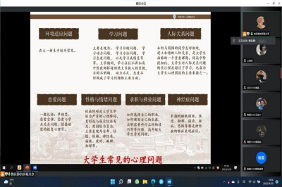 4月27日面向77779193永利官网2021级全体心灵使者,开展线上“2021级心灵使者培训”活动。旨在进一步丰富心灵使者的专业知识,提高心灵使者责任感,并进一步对同学们的心理问题进行疏导。心理健康指导老师陈恺盛进行指导教育,令其明确自身工作任务,理解自身定位要求,并逐步强化心灵使者应具备的工作能力和应掌握的工作方法。