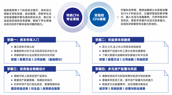 【CFA核心正课】:四大学期主题,逐步引导学生从资本市场基础认知,过渡到与CFA协会核心就业方向紧密对接的实战应用能力培养。