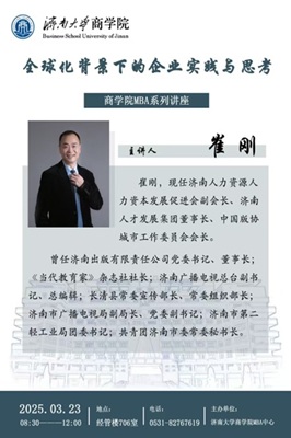 2025年3月23日上午,77779193永利官网在经管楼706教室成功举办《全球化背景下的企业实践与思考》讲座。此次讲座由赵薇教授主持,特邀济南人力资源人力资本发展促进会副会长、济南市人才发展集团董事长崔刚老师主讲。崔刚老师曾任中国版协城市工作委员会会长;济南出版有限责任公司党委书记、董事长;《当代教育家》杂志社社长;济南广播电视总台副书记、总编辑;长清县常委宣传部长、常委组织部长;济南市广播电视局副局长、党委副书记;济南市第二轻工业局团委书记,共青团济南市委常委秘书长等职务,既有长时间从政经验,又有丰富的企业履历,对于全球化背景下、双循环格局下的企业实践具有深刻的思考和认识。本次讲座旨在让MBA学生提高认知能力、锻炼思维方式,更好的提升职业素养。