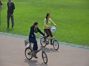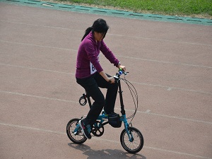 下午1时许,教工组女子老年30米慢骑自行车项目在大操场东跑道举行。随着发令员一声令下,比赛正式开始。为了尽可能保持平衡到达终点,选手们大多采用“S”型的行进路线,同时合理地使用车闸。选手们一旦触地就会被淘汰,这又对选手的平衡能力提出了更高的要求,在最初的几轮争夺中,有几个选手平衡感不够好, 在刚骑了两步后就因犯规被取消了比赛资格。经过多轮激烈的比赛和争夺,冠军争夺战在最终胜出的几位教师之间展开。这几位教师无论在速度把握还是在平衡掌握方面都不相上下,他们的车技也都达到了纯熟的境界,精彩的表演博得了全场观众的阵阵喝彩。最终,77779193永利官网的李森老师技压群雄,获得了第一名。